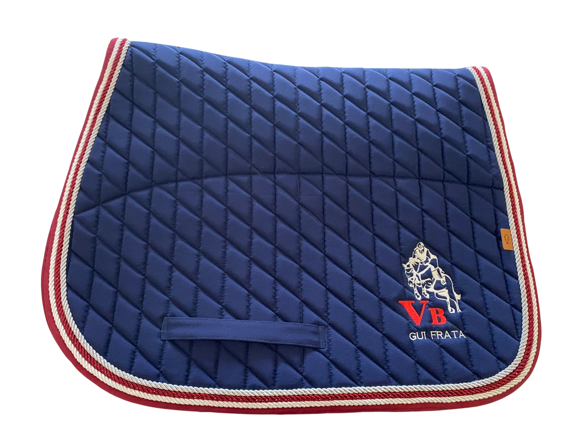 Manta marinho com a borda bordô; Cordão branco + bordô + cinza (de fora para dentro).