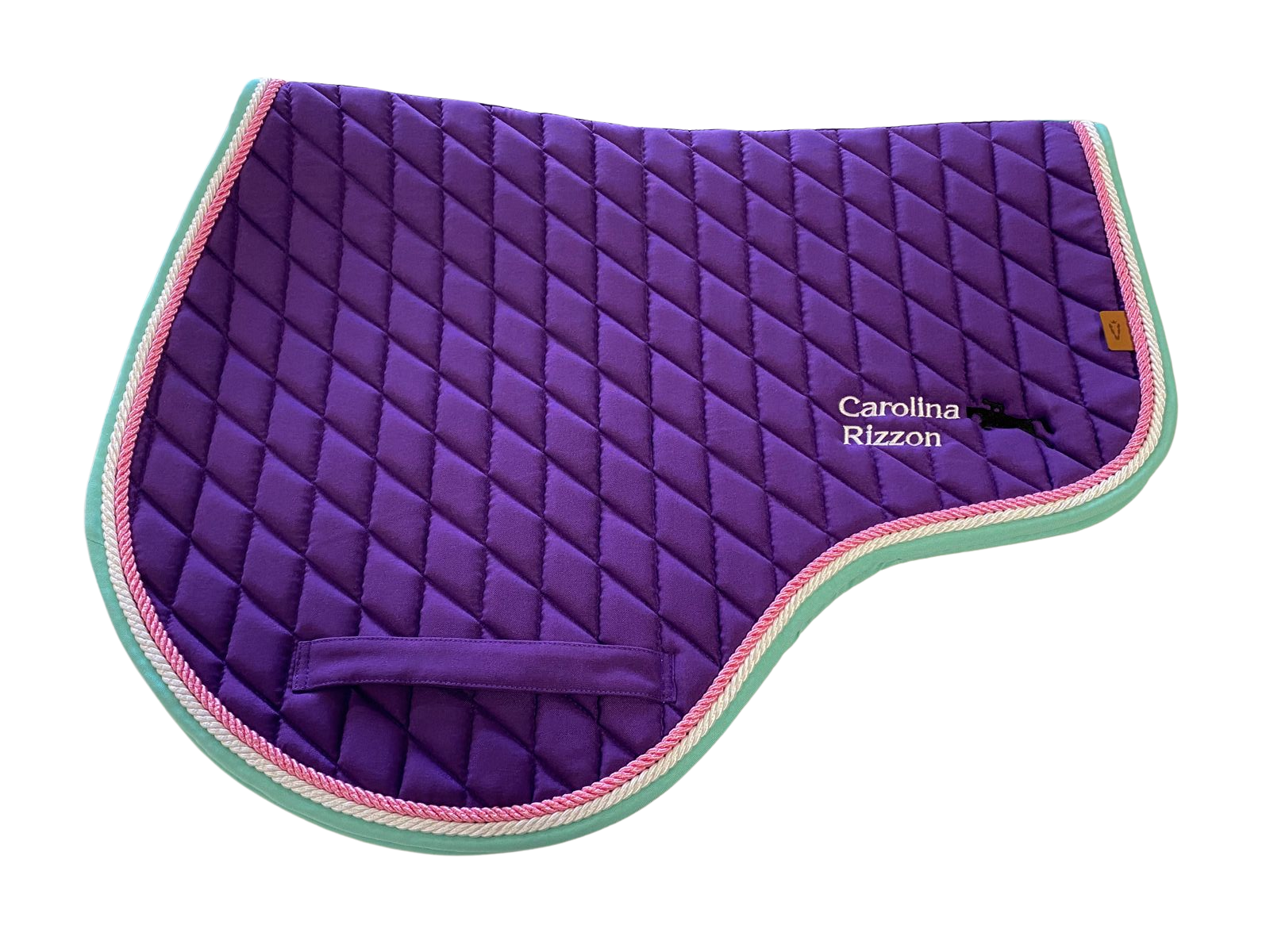 Manta roxo com a borda verde água; Cordão branco + rosa chiclete (de fora para dentro).