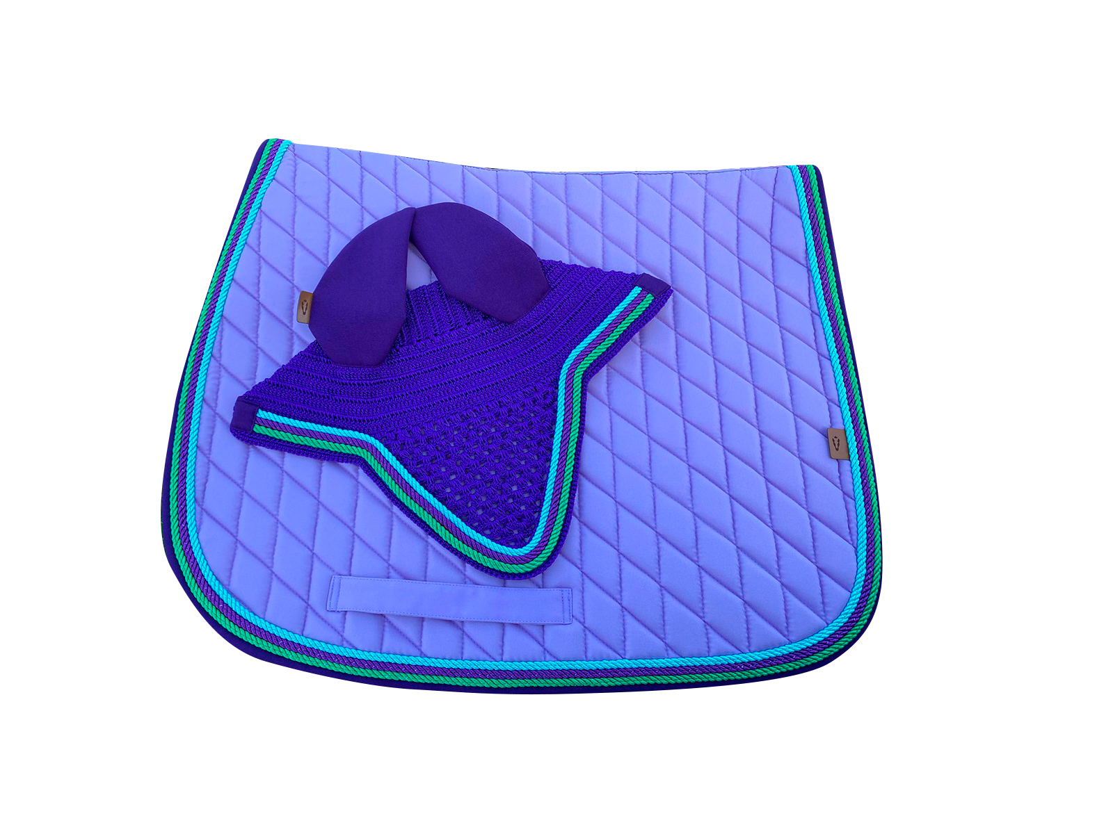 Conjunto lilás com a borda roxo; Cordão verde bandeira + roxo + verde água (de fora para dentro).